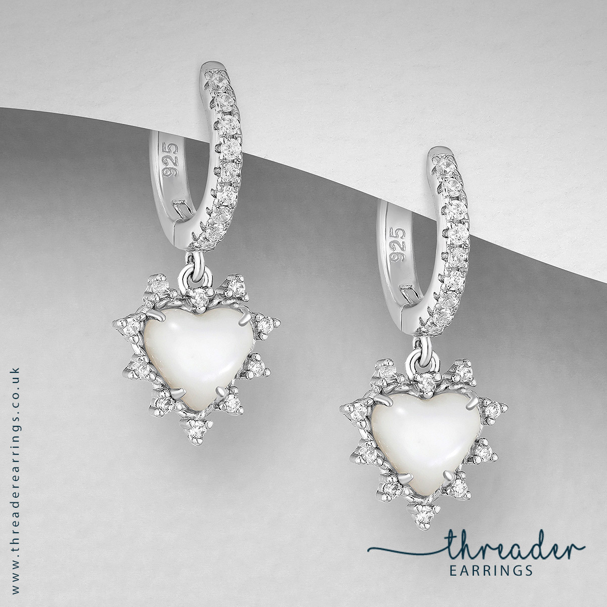 These sterling silver hoop earrings have a bit of a modern fairytale feel. Each huggie-style hoop is set with a neat row of clear cubic zirconia stones, and finished with a heart-shaped drop made from glossy white shell. Around the edge of each heart is a spiky halo of tiny Cubic Zirconia stones, giving them a slightly regal, crown-like look.