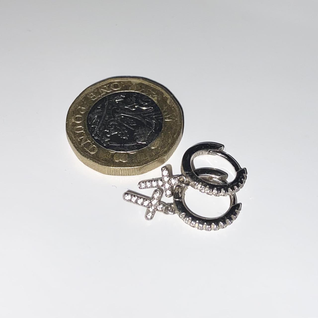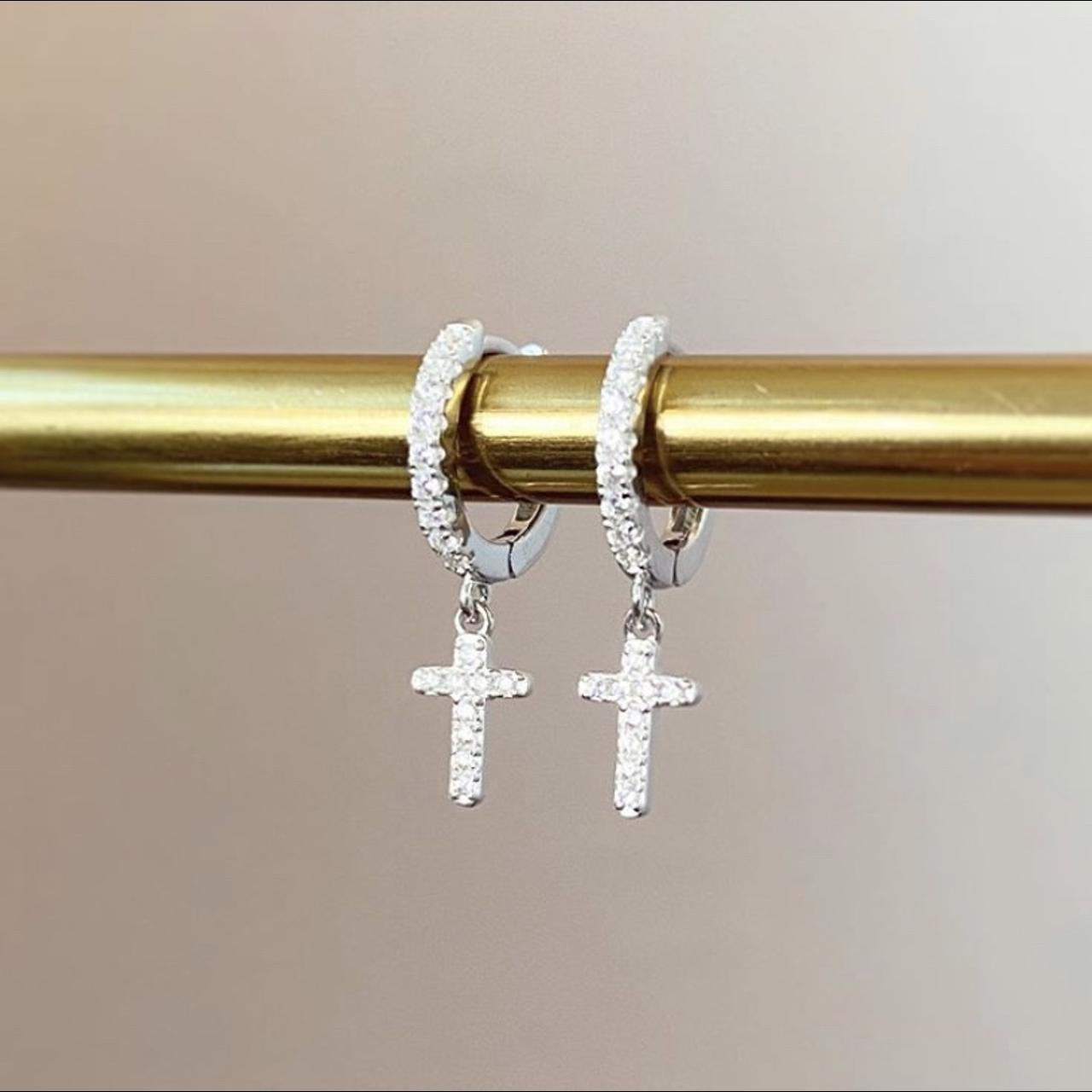 You are here: Home » Shop » Silver hoop earrings » Sterling silver hoops with cross dangly