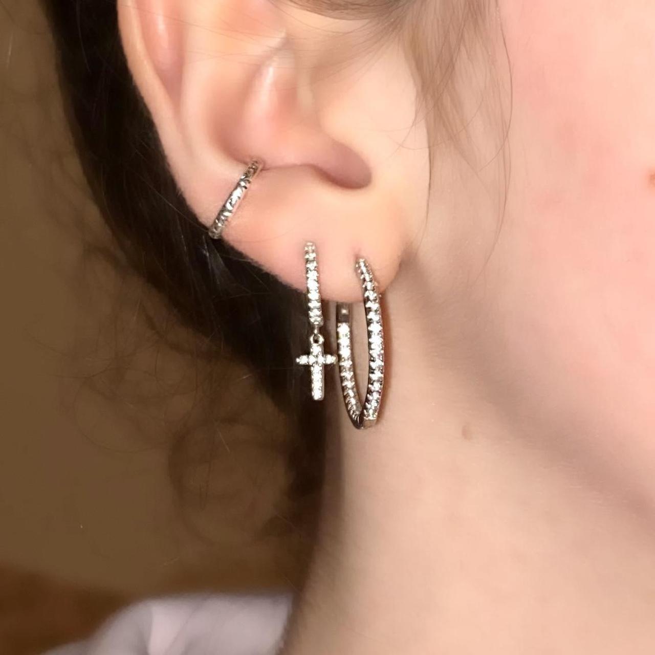 These small hoop earrings feature a subtle cross charm, adding a gentle glimmer to everyday style. Crafted from 925 sterling silver with a rhodium finish, each hoop is pavé set with cubic zirconia for a touch of sparkle. The design is understated and easy to wear, making them a thoughtful detail for casual or elegant looks.