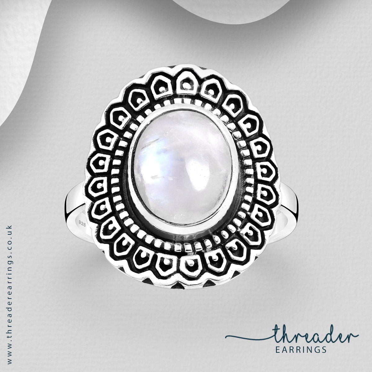 Beautiful patterned moonstone ring in 925 Sterling silver